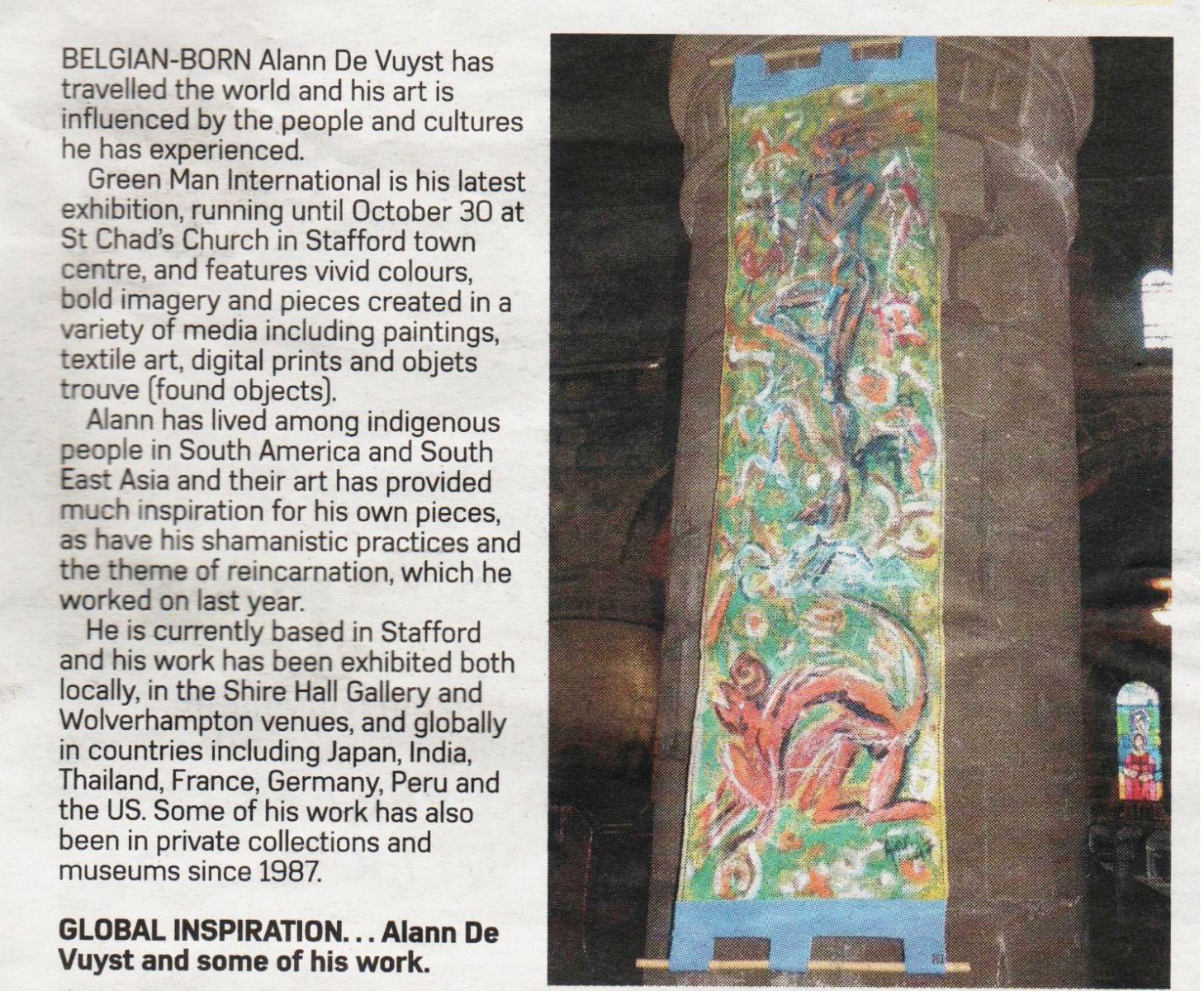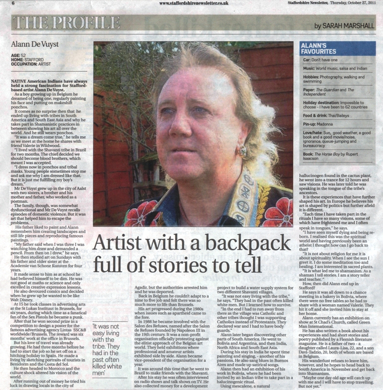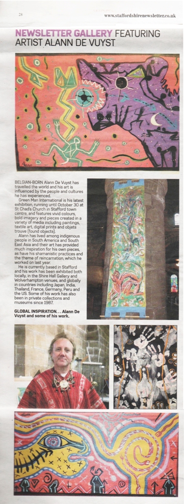 But the biggest disappointment was the press. Having shot at least 20 pics of me, nothing of the show was announced until father Michael, again, went to talk to the Star & Express local newspaper. I wondered if they hated my guts, because I had refused to take off a pre-Columbian woolen mask, which I was wearing for the photo shoot. I wore that mask to make the link of the Pre-Columbian and pagan heritage from around the world with the Green Man from Stafford.